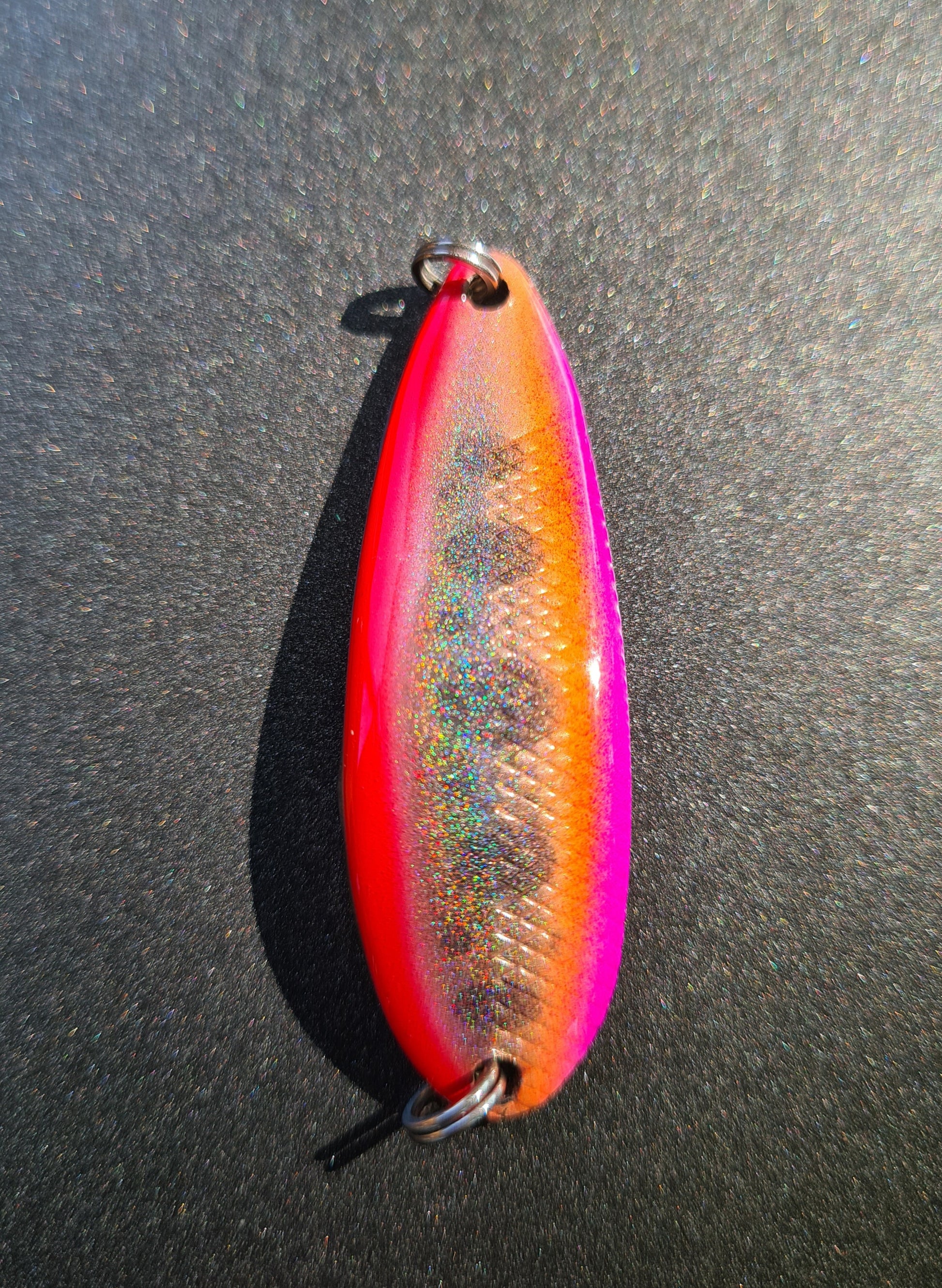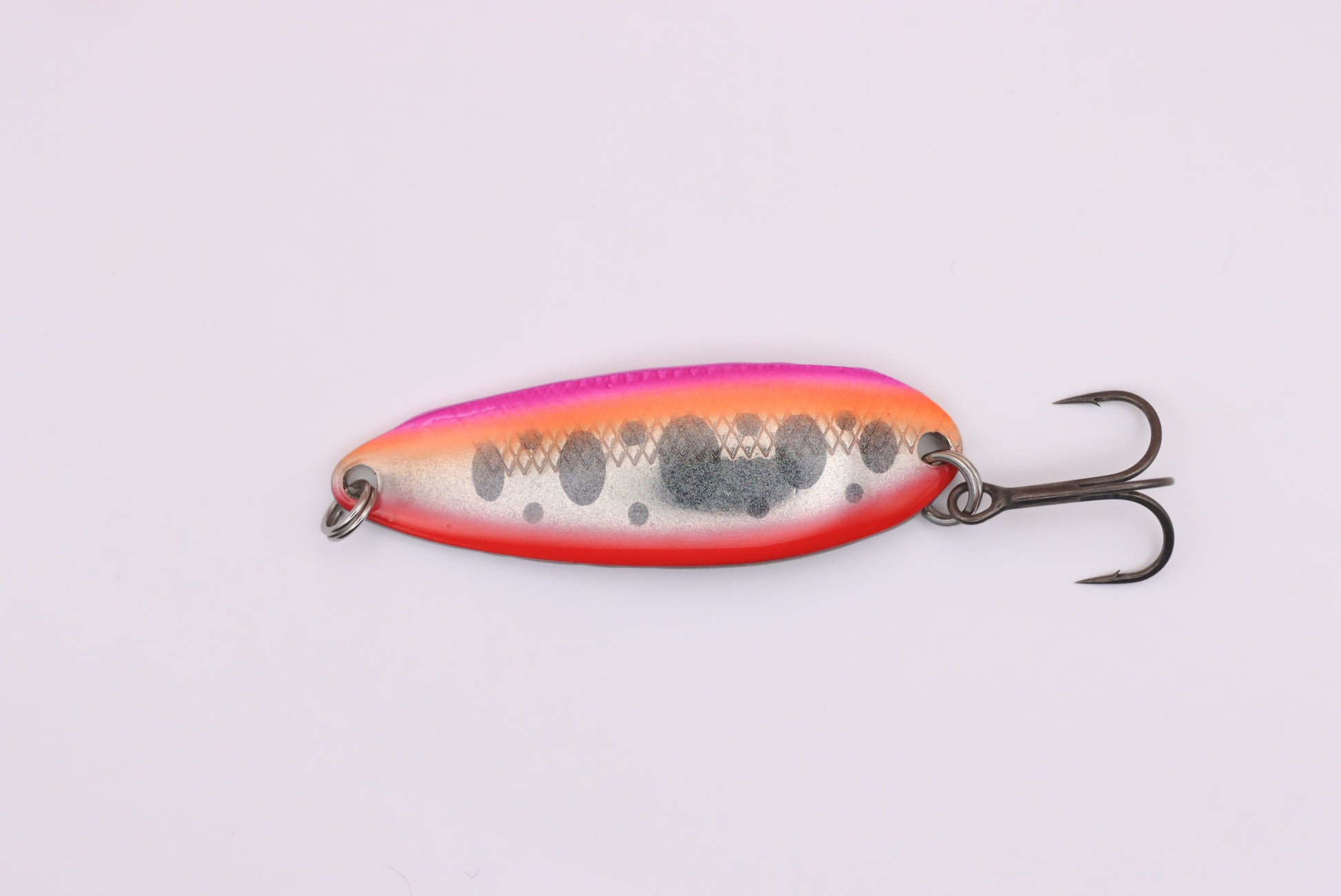 In ediție limitată o cominatie deosebita. Oscilante hand made pentru pescuitul de pastrav, clean sau biban. Produse cu materiale de calitate și pattern unic, pentru a atrage prin realism. Ofera reflexii deosebite cu efect cameleonic in lumina directa a soarelui, efectul se poate vedea in poza nr 2. Testată cu succes pe lacurile sălbatice din România, această nălucă va fi cea mai buna alegere pentru prinderea pastravului. Poate cea mai echilibrata si ușor de pescuit, aceasta oscilanta poate fi folosită si la trena sau spinning de pe mal.